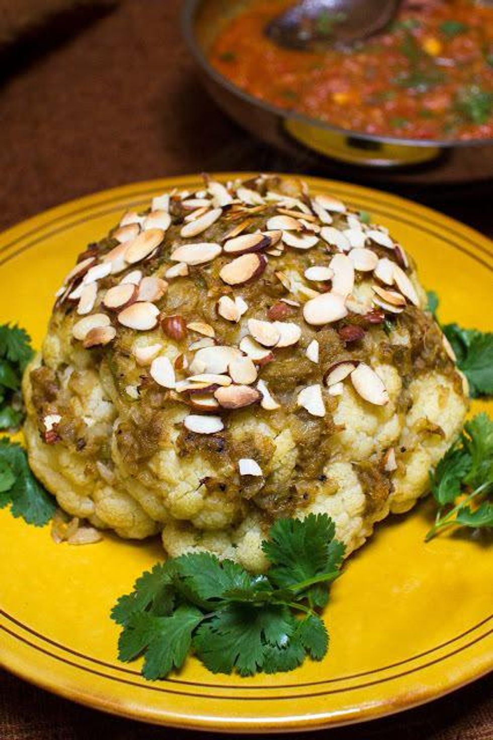 To stuff the cauliflower, push half of the spice paste mix in among the florets.