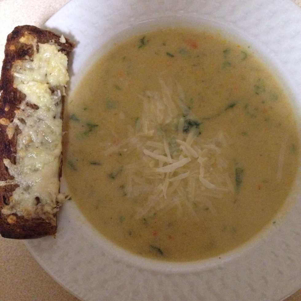 Cream your soup with a hand blender, then add parsley and celery leaves. Enjoy it with the garlic bread.