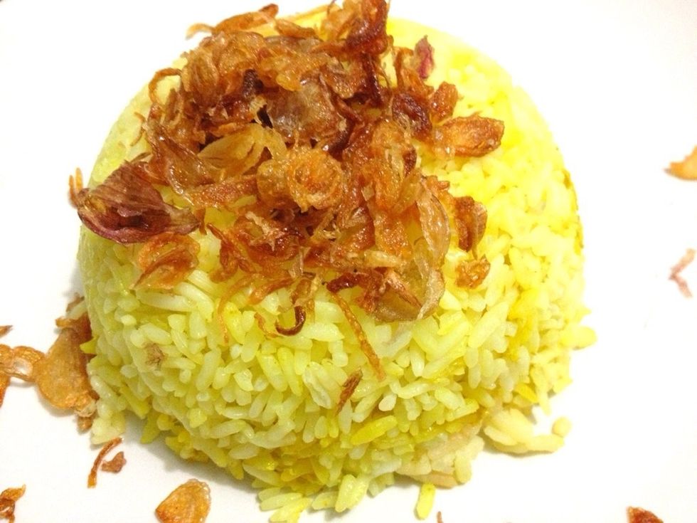 Our celebration yellow rice's ready! You can have it with Indo traditional side dish i.e galangal fried chicken, spicy egg, prawn fritters, etc. And yet, it is still yummy with fried shallots Enjoy :)