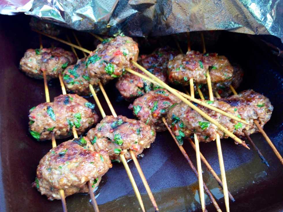 Also add vegeta. Mix. Then form ovale meatballs and put on wooden skewers (that must soak in water at least 2 hours). Grill for about 8 minutes.