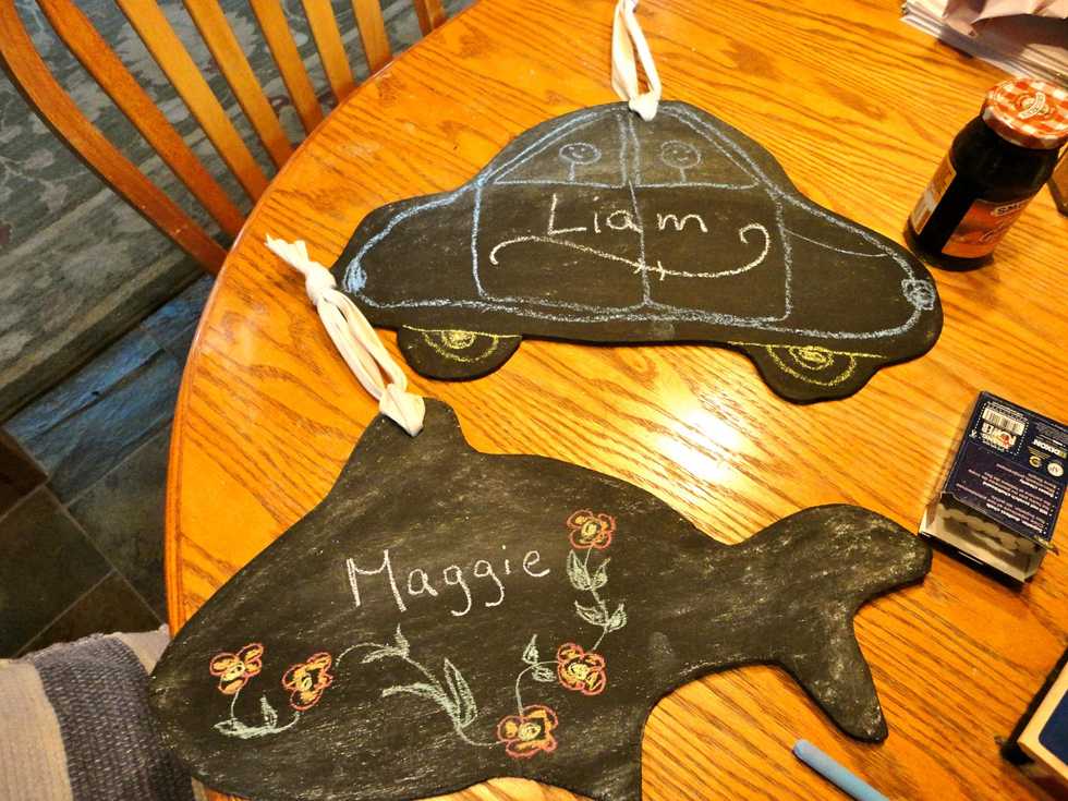 When the paint is dry the trick is to take the side of a piece of white chalk, rub all over the board with it and then wipe it off. And you're done! These can be made using different colours of paint!