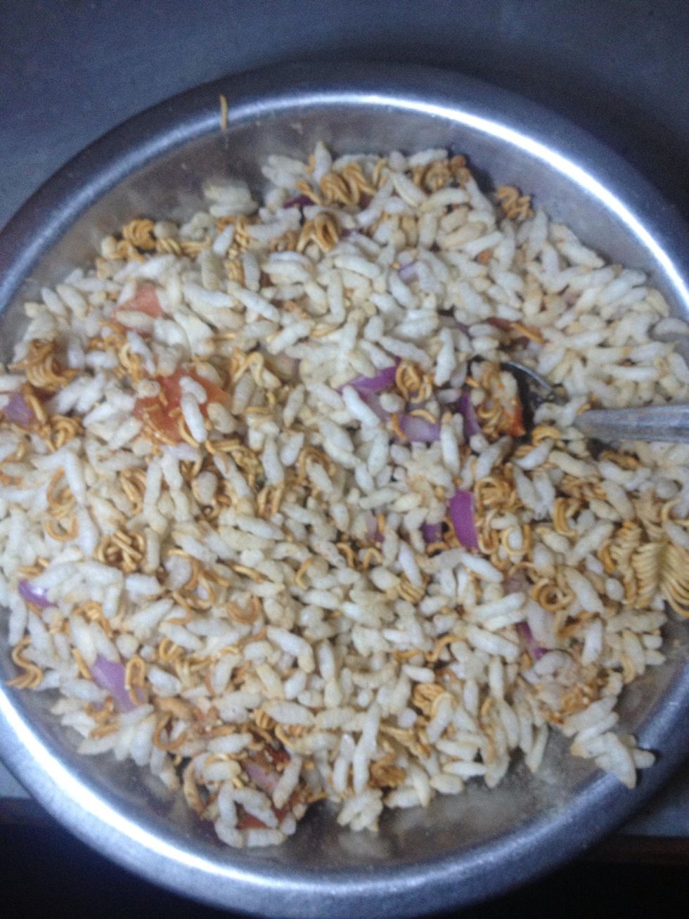 Pour the pack of Nepali Noodle in a bowl with puffed rice.