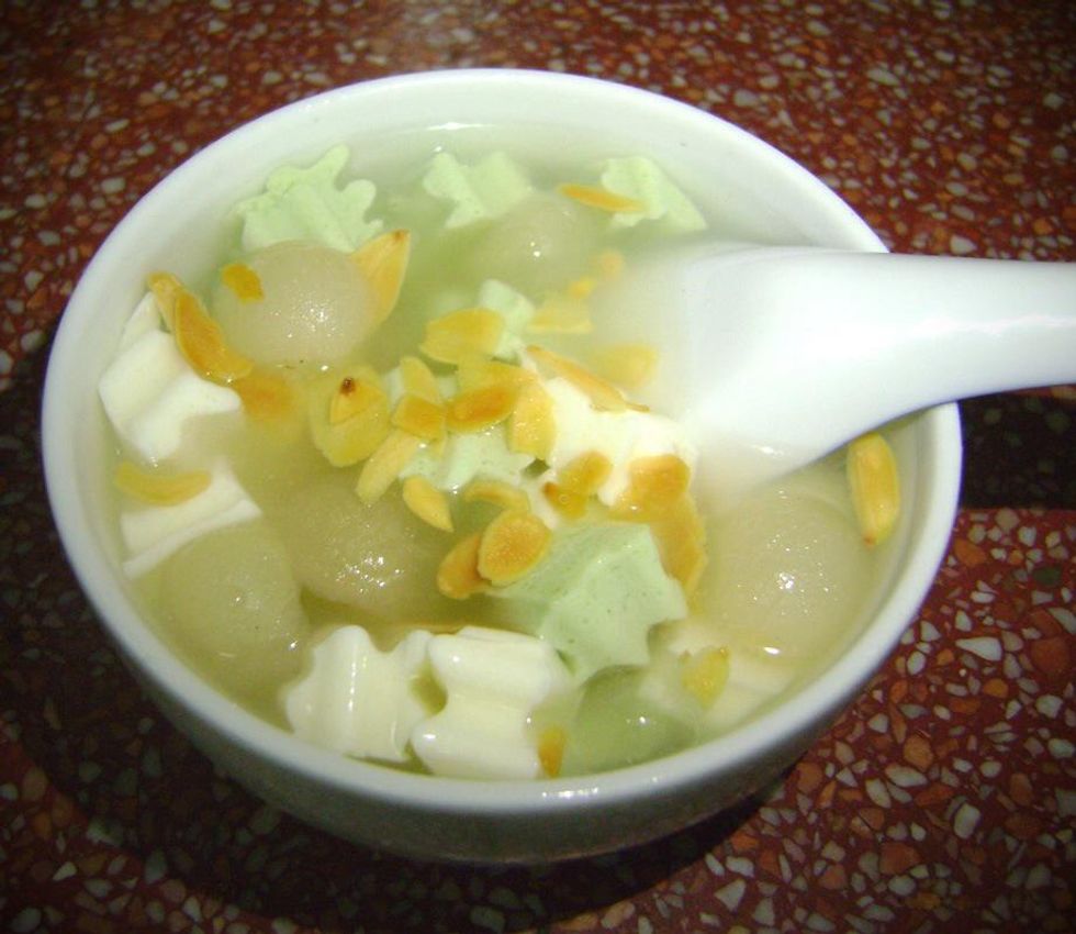7. Assemble the dessert: fill in gelatin pieces, fruits, some ice and pour in the syrup. Top with almond slices.