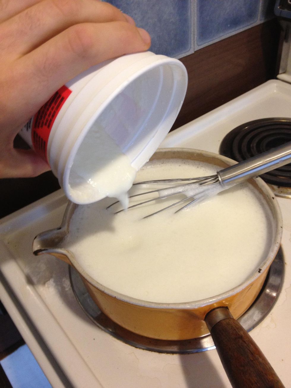 Only once the milk is slightly warmer than room temperature, add your plain yogurt starter. Mix well into milk.
