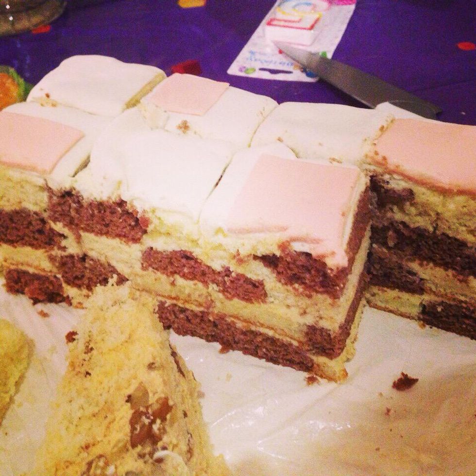 And when you cut the cake you'll get checked design, I wished I made thinner strips. Well, not bad for the first try. :) and the most important, my son loved it :)