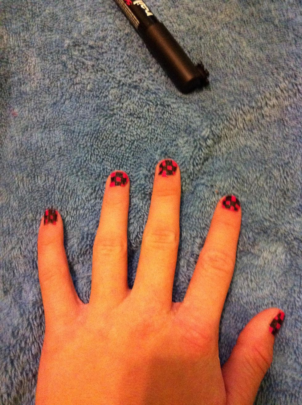 Paint all nails one color and allow them to dry(:Using nail art pin make black linesMake them go ther wayColor in every other one and your done