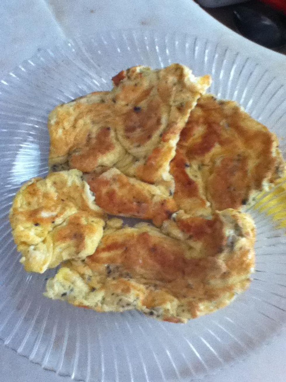 Ingredients Shred the cheese of your choice Add eggs and oregano and mix Put butter in a pan Wait until it melts Pour the egg mixture Wait till it bubbles Cut in 2 or 3 pierces with the help of your wooden spoon and flip it Enjoy :)