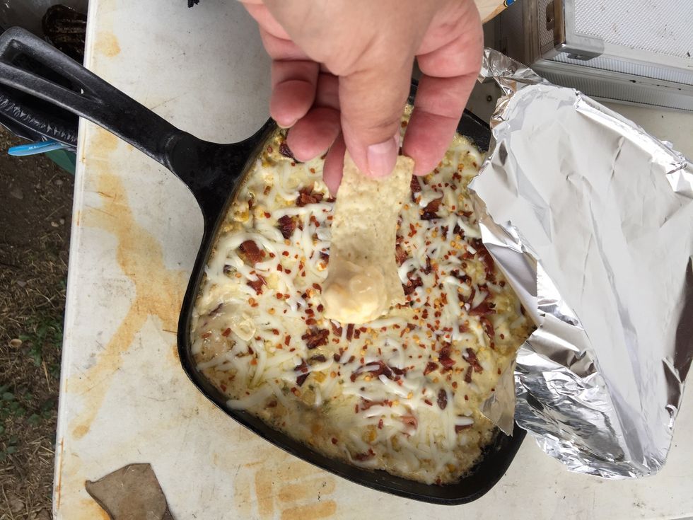 Crumble bacon add in mixture. Save about two strips for topping