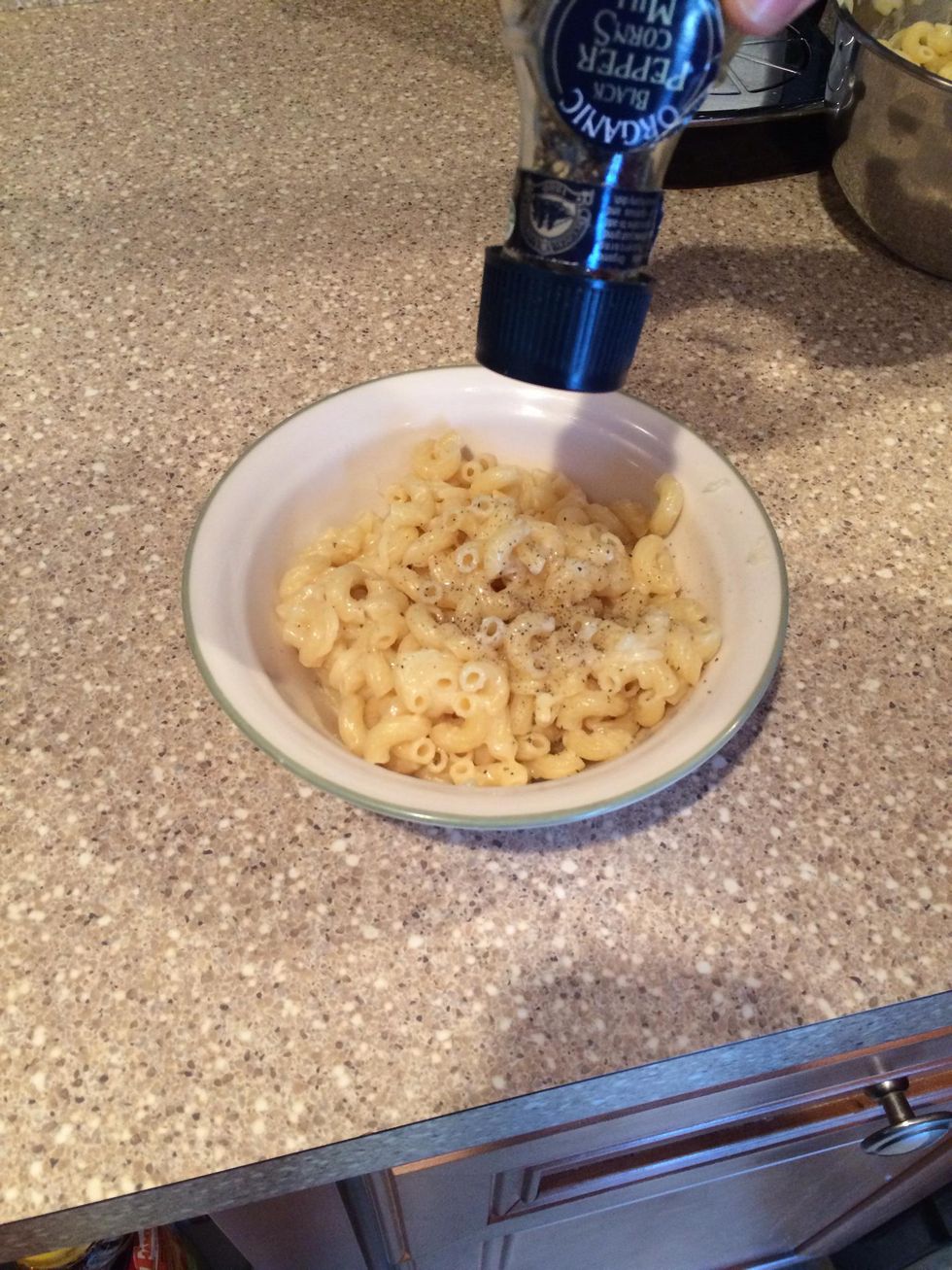 2.0c Water2.0c Dry pasta 1 pack of shredded cheese 1.0 A sauce pan 1.0c Bowl 1.0c Spoon Salt & pepper Strainer