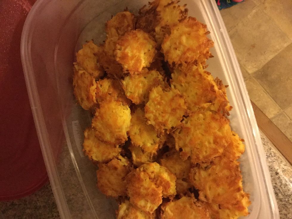 Ingredients: 8 cups of shredded potatoes/hash-browns, 3 tbsp of corn starch, 3 eggs, 1 tsp of garlic powder, 6 ounces of shredded cheese, 1/2 tsp of salt and pepper.