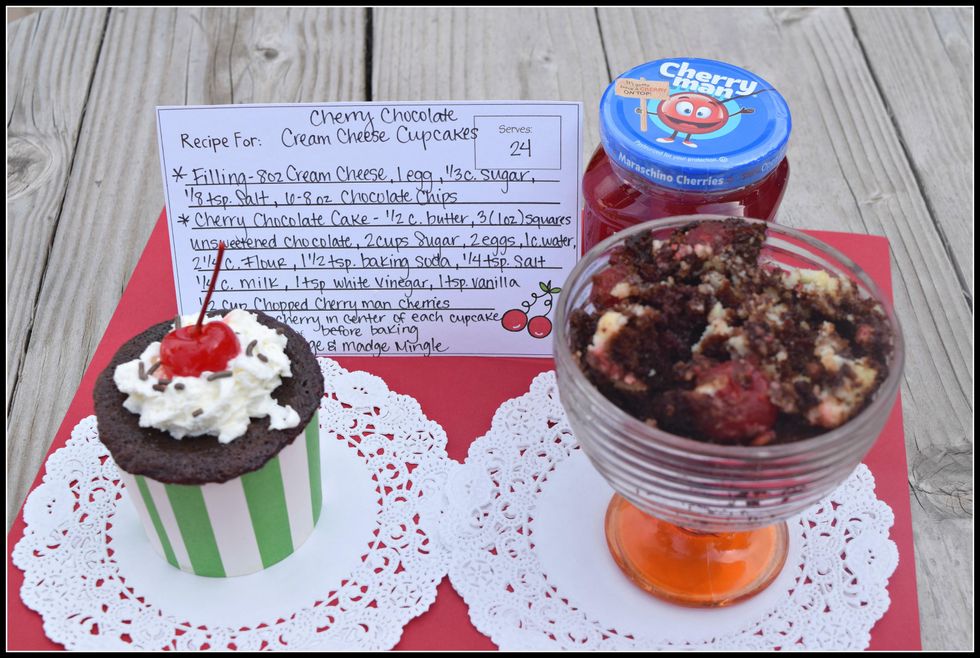 1 1/2 tsp Baking Soda, 1/4 tsp Salt, 1/4c Milk, 1 tsp White Vinegar, 1tsp Vanilla, 1/2c Chopped Cherry Man Maraschino Cherries. Mix ingredients, be sure to not over mix or your cupcakes will fall.