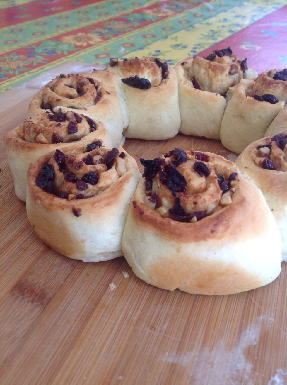 Place in a buttered cake pan. Cover and let sit until doubled in volume. Brush with milk and place in the oven at 375F for 25 min