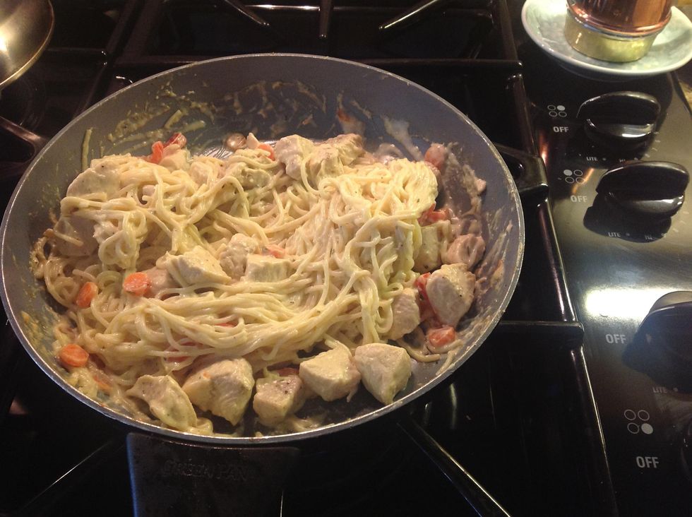 Once chicken is cooked add in peppers, carrots, and Alfredo sauce
