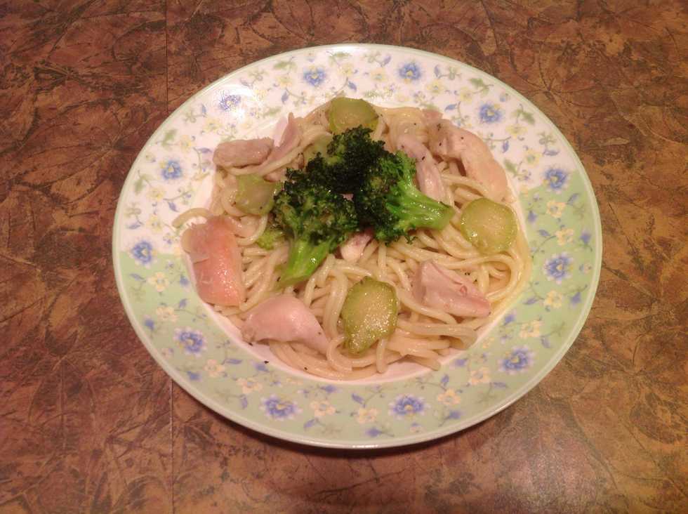 Add the pasta, reserved pasta water, chicken, remaining 1.25mL of salt, and a few grains of pepper. Cook until heated through. Approximately 3 minutes.