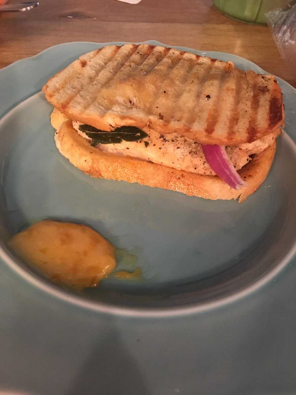 After sandwich is built spread butter on outside of bread and place it on you Panini press and cook.