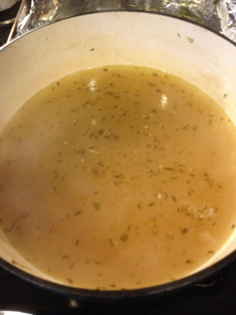 After at least an hour strain out chicken, bones, herbs and veggies.