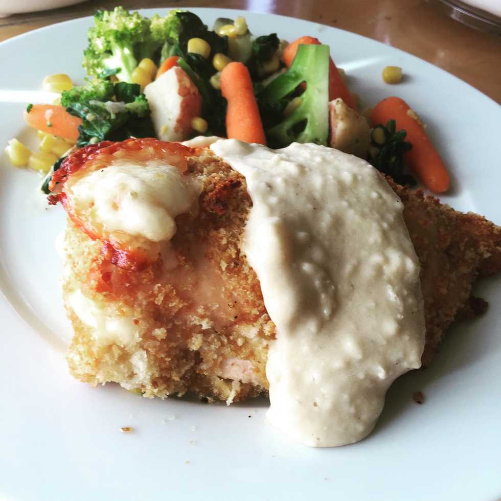 Roll it in the bread crumb and baked at 425F for 25-30 min.
