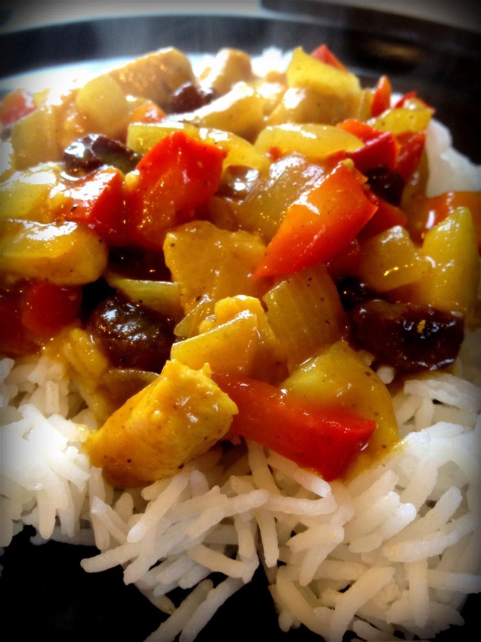 Pour in broth and raisins. Stir. Reduce heat to low and simmer for 20 minutes to blend flavors (about the time it takes to cook the basmati rice).