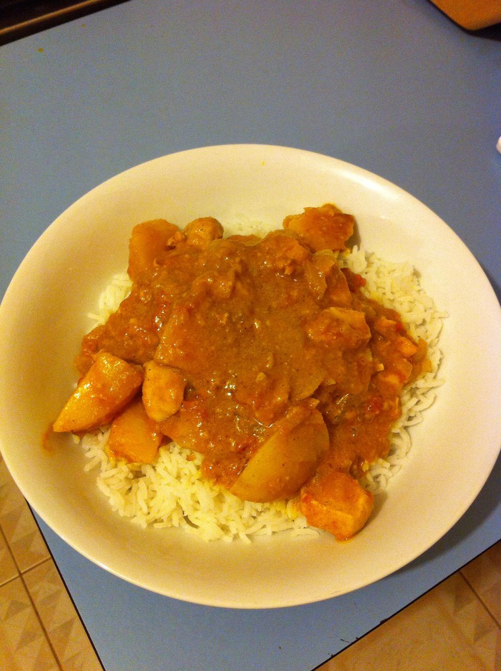 I've now added the water, and stirred quite well. Add the canned tomatoes and coconut cream. I use "ayam" coconut cream.