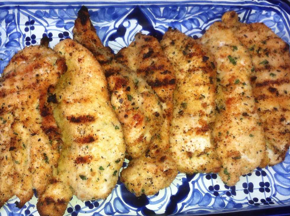 Place oiled up chicken in bread crumb mixture. Coat evenly.