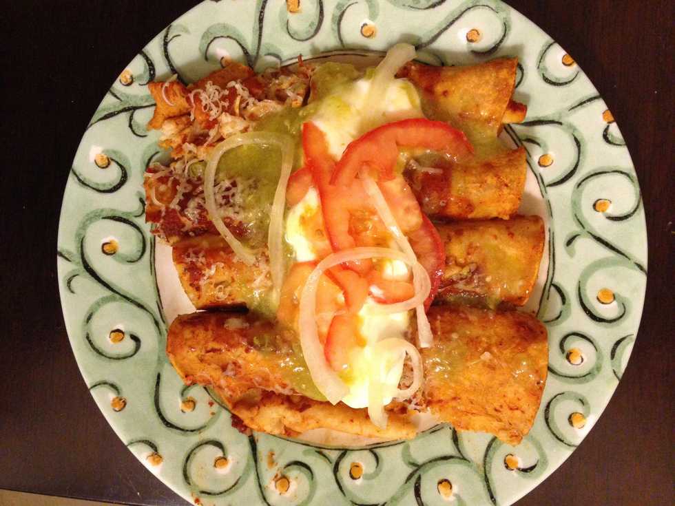 Dip tortilla in the sauce. Place it in your baking dish and start adding a bit of your chicken or potato filling. Roll it up and set on the edge of the dish. Keep dipping and rolling until done.