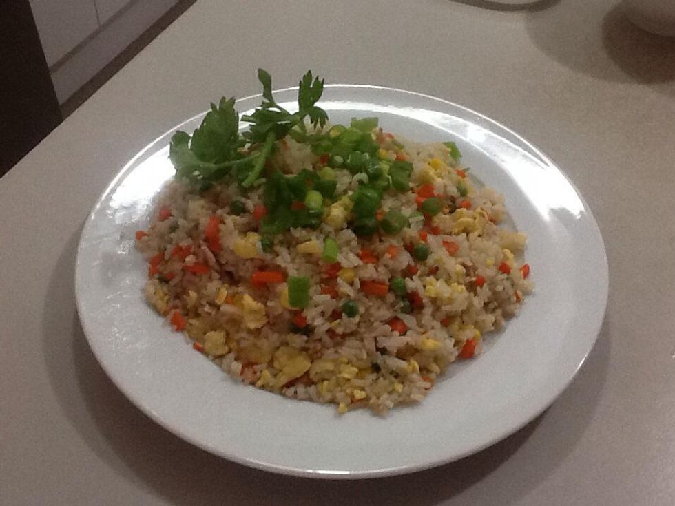Add some spring onions and give it a final stir. Once done, put the finished product onto a plate.
