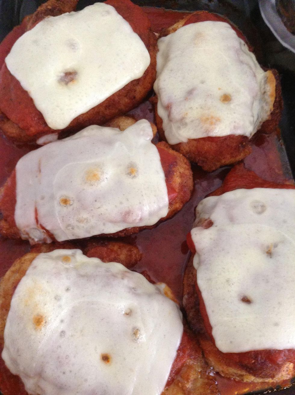 When chicken is fully cooked, add it to the pan, with a spoon add some more spaghetti sauce on top of the chicken breasts. Add a slice of mozzerella cheese to each,and put into oven.