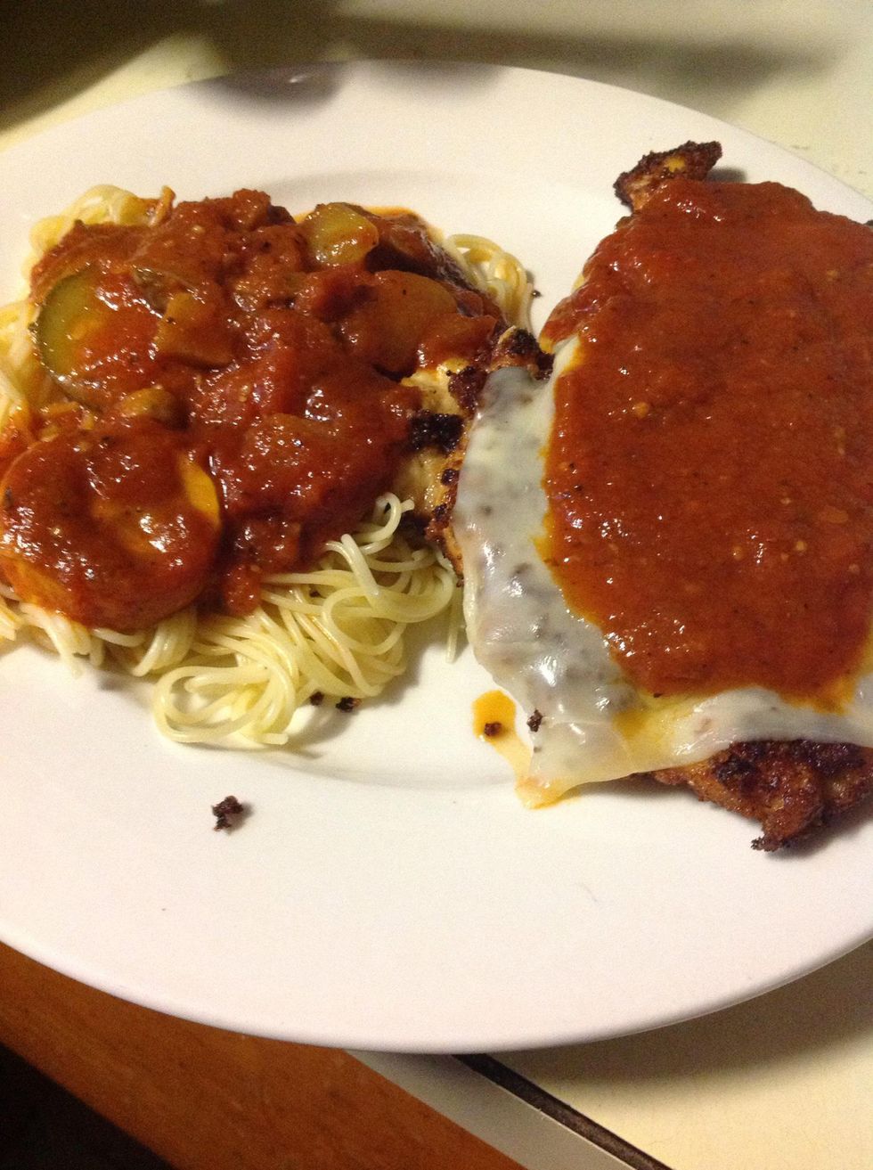 Bring it all together on one plate. Place mozzarella cheese on chicken and place pasta on plate, place red sauce on both to your liking.