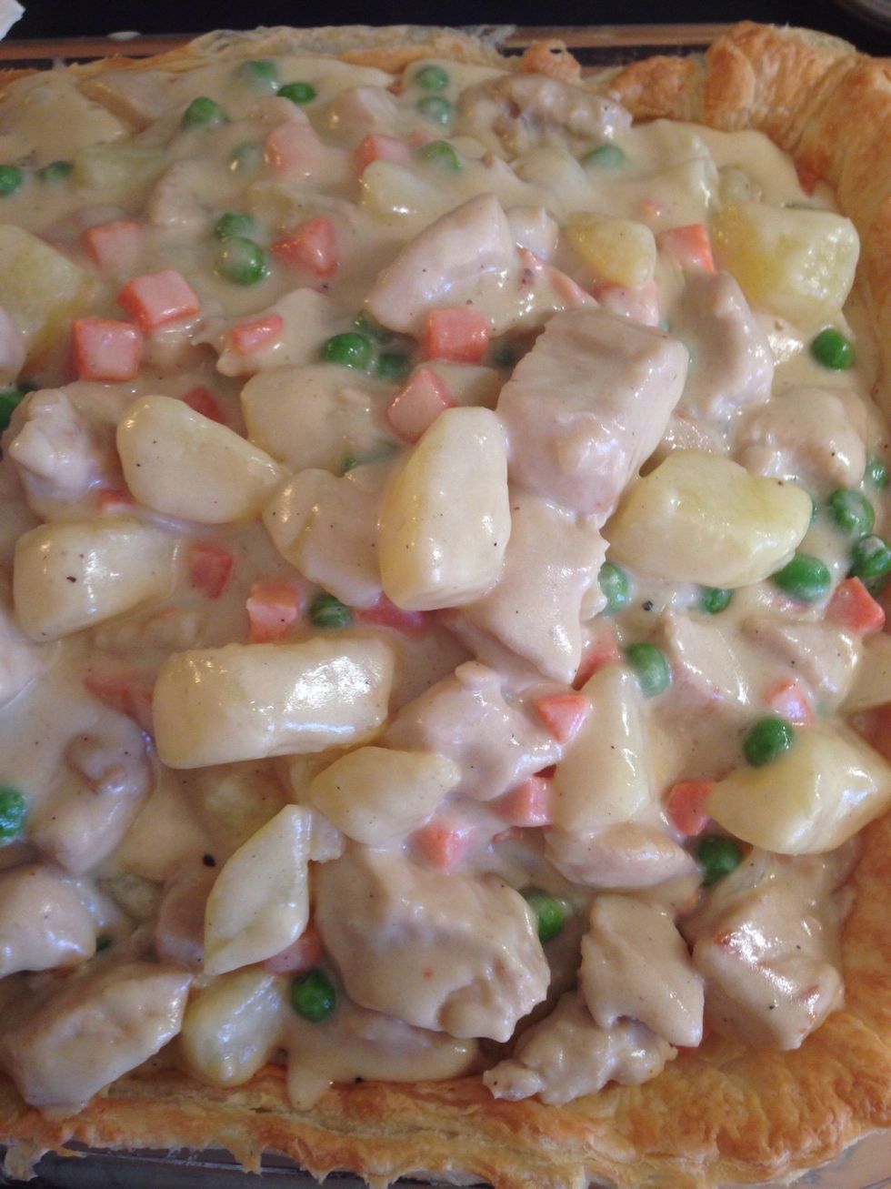 When you made your chicken filling thick and creamy, NOT RUNNY!! You start filling your pie, add more pie crust on top and let bake.