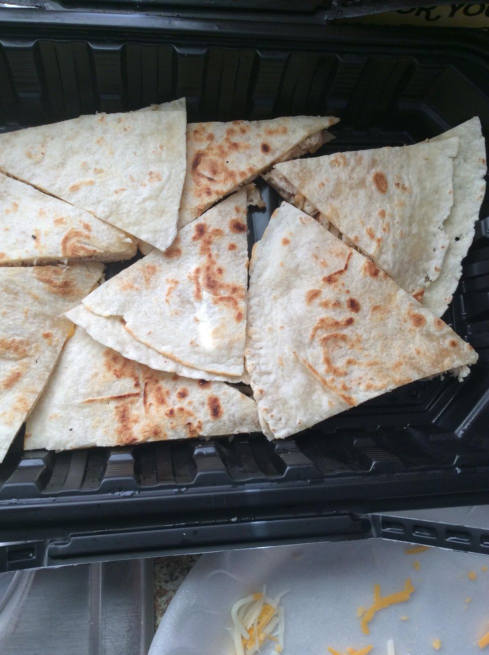 Add your chicken and cheese. Start heating your top piece of the Quesadilla.