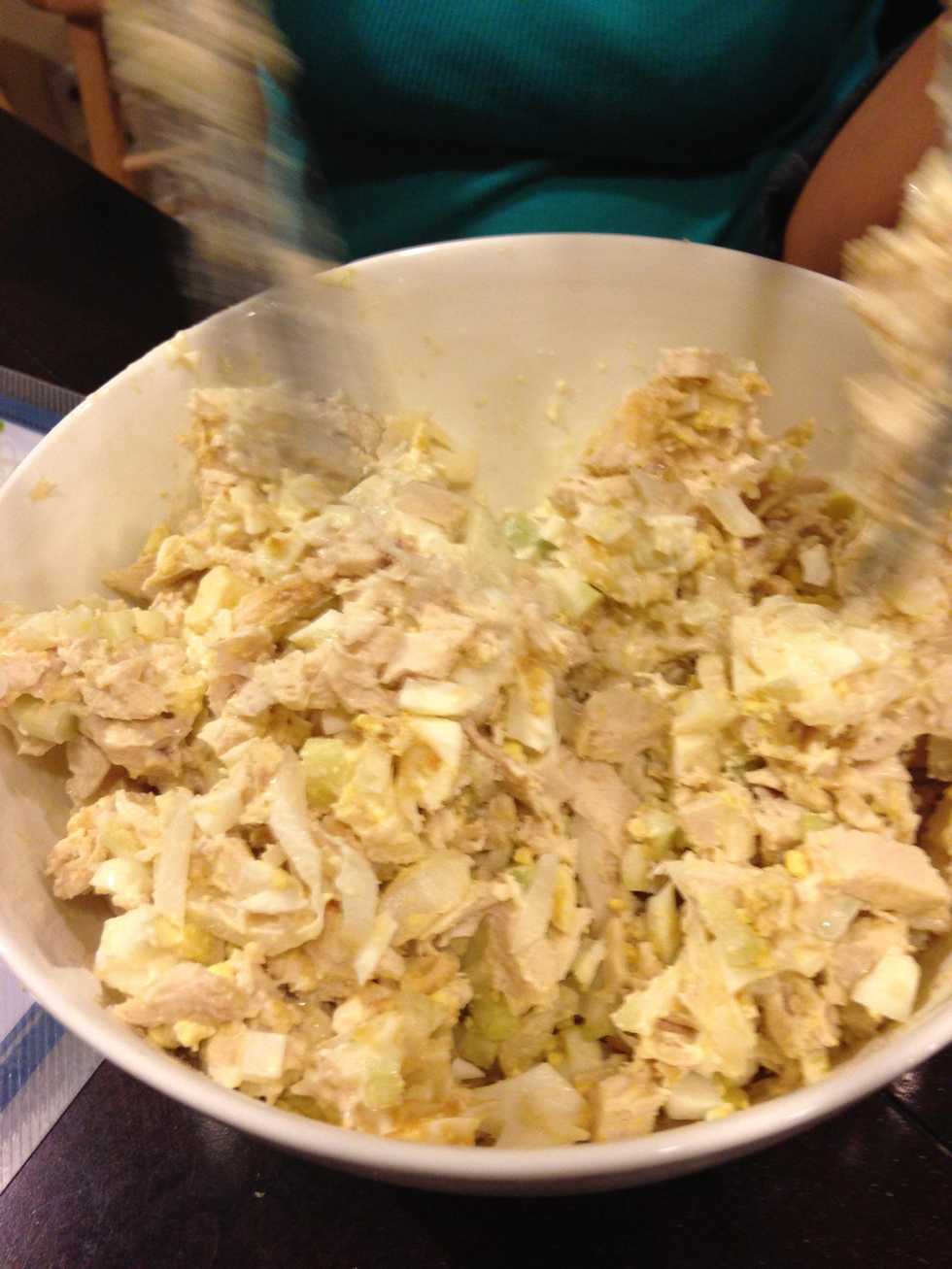 Sweet onion, celery, eggs and chickenAdd salt, garlic powder, onion powder, Worcestershire sauce, mayo, black pepper