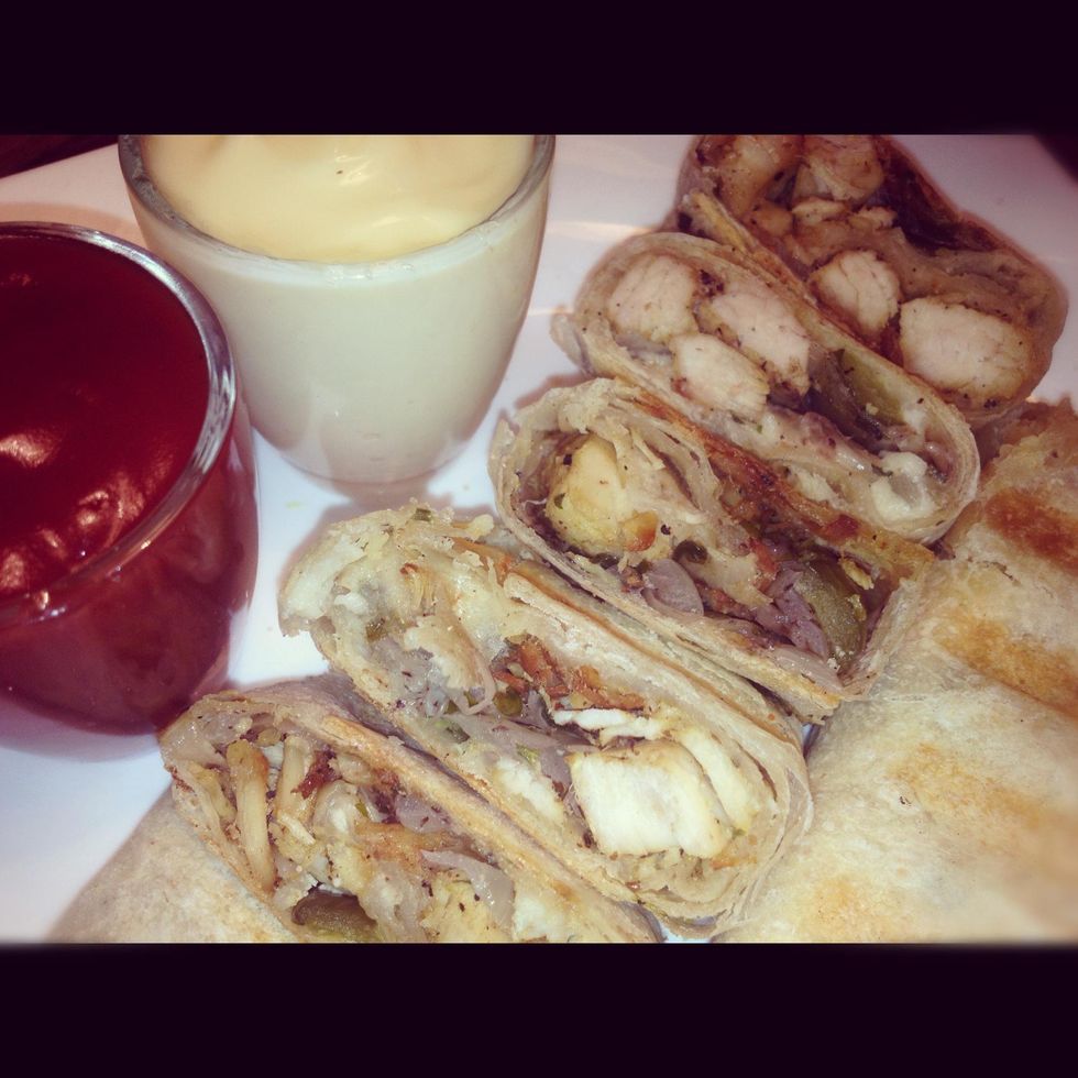All the ingredientsSpread the shawerma sauce on the breadPut the Shawarma salad and the Cucumber pickleAdd the chickenRoll the bread in this wayPut the Shawarma on the grill