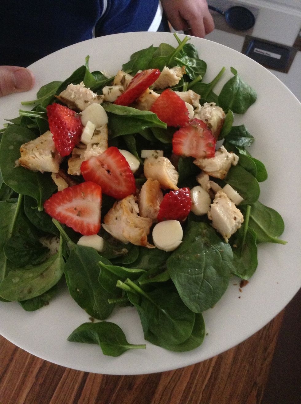 Build your salad. Layer spinach, celery, chicken, strawberries, walnuts. Use a vinegarette dressing