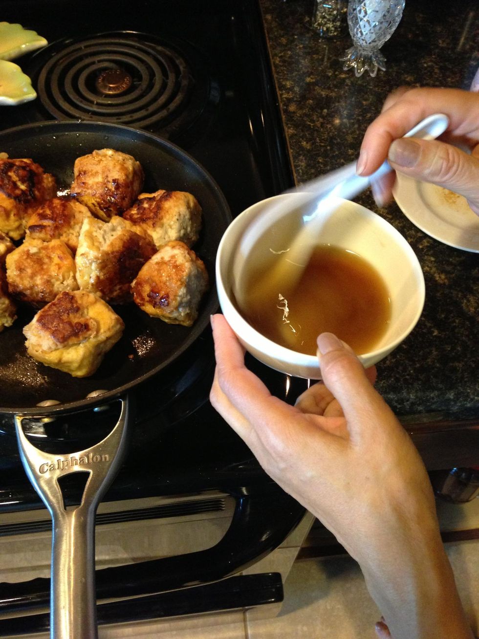 Place the tofu with chicken into a pan with oil on low and put a lid on and place on medium heat. After around 10 minutes you need to rotate the pieces to cook evenly