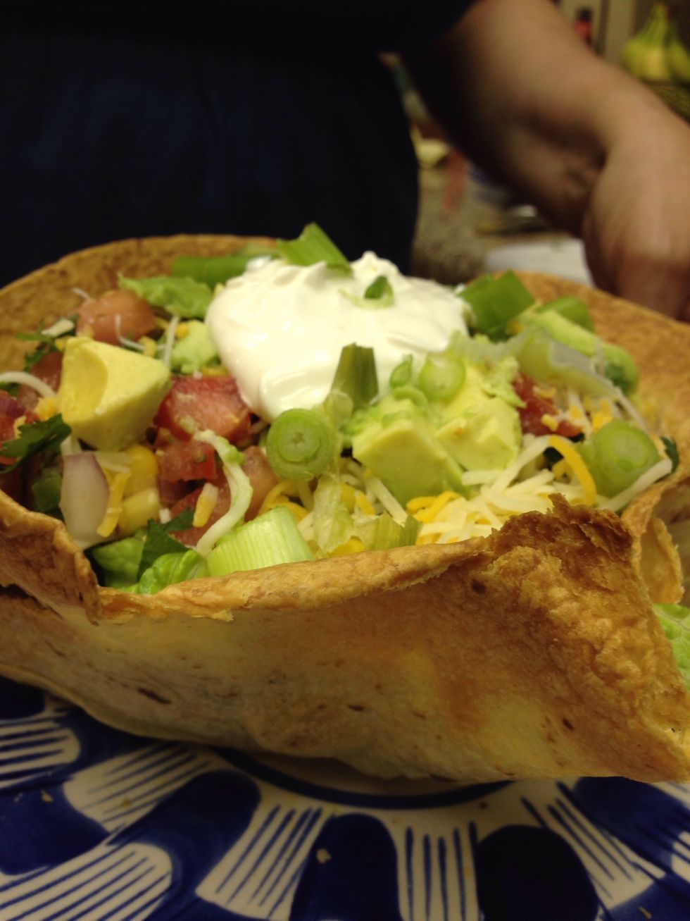 All the condiments. Layer all the ingredients in the taco bowl shells and enjoy :-)