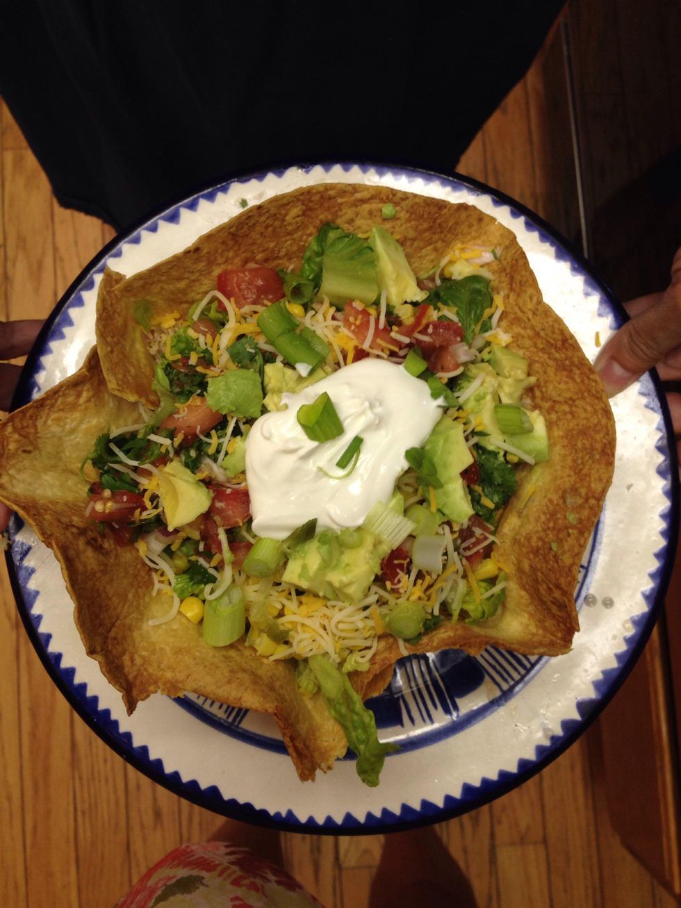 All the condiments. Layer all the ingredients in the taco bowl shells and enjoy :-)