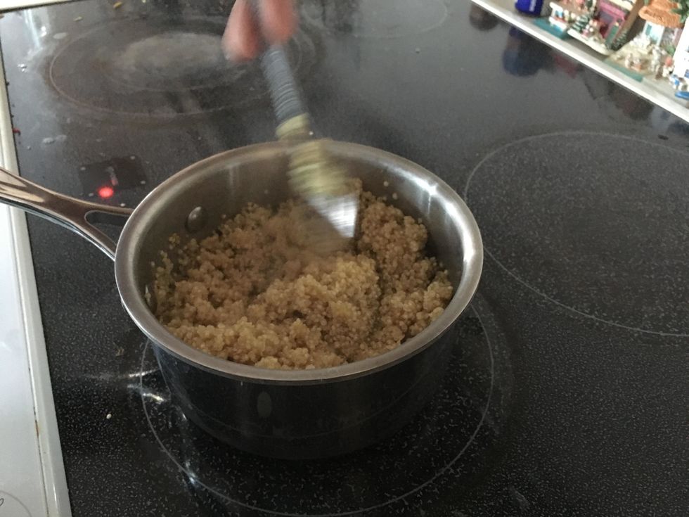 Place chicken broth and quinoa in a medium saucepan. Bring to a boil then reduce heat to low, cover and let simmer for 10 minutes.