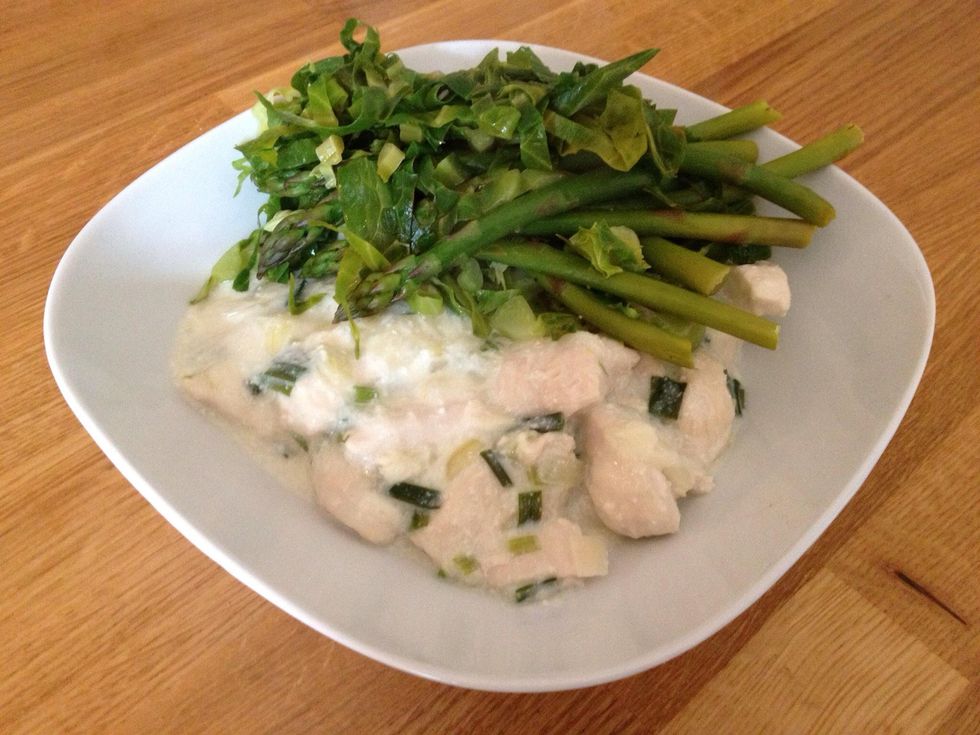 Once the chicken is cooked add the roughly chopped three cornered leek and heat through. Don't cook for two long as it will destroy the delicate flavour.