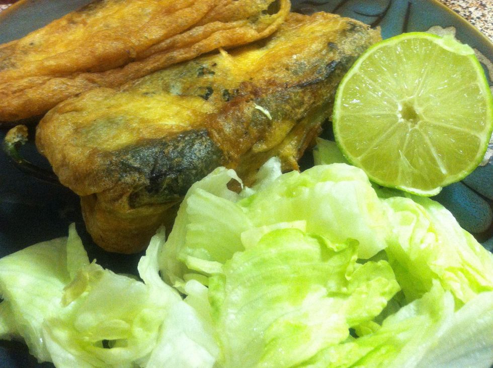As you can see i used a toothpick close the peppers back up. When the pepper is stuffed cover them with flour. This will help the egg stick to the pepper.