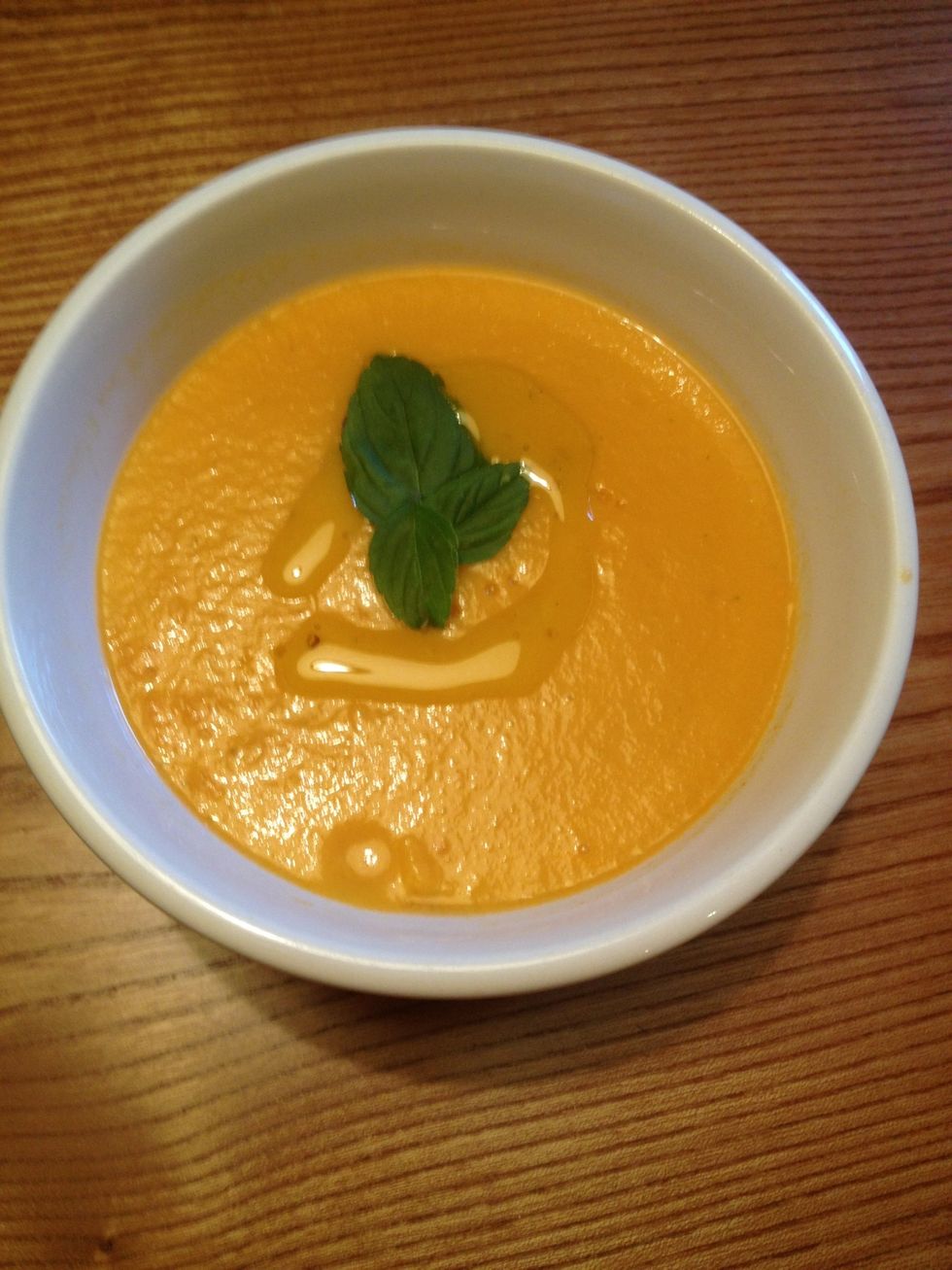 Pour the soup into individual bowls. Swirl some olive oil on top and garnish with a couple basil leaves.