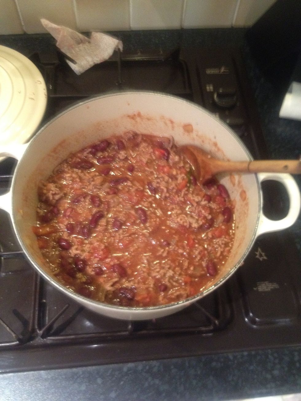 Add the mince, kidney beans, chopped tomatoes, season with salt and pepper bring to the boil then simmer for 1 hour