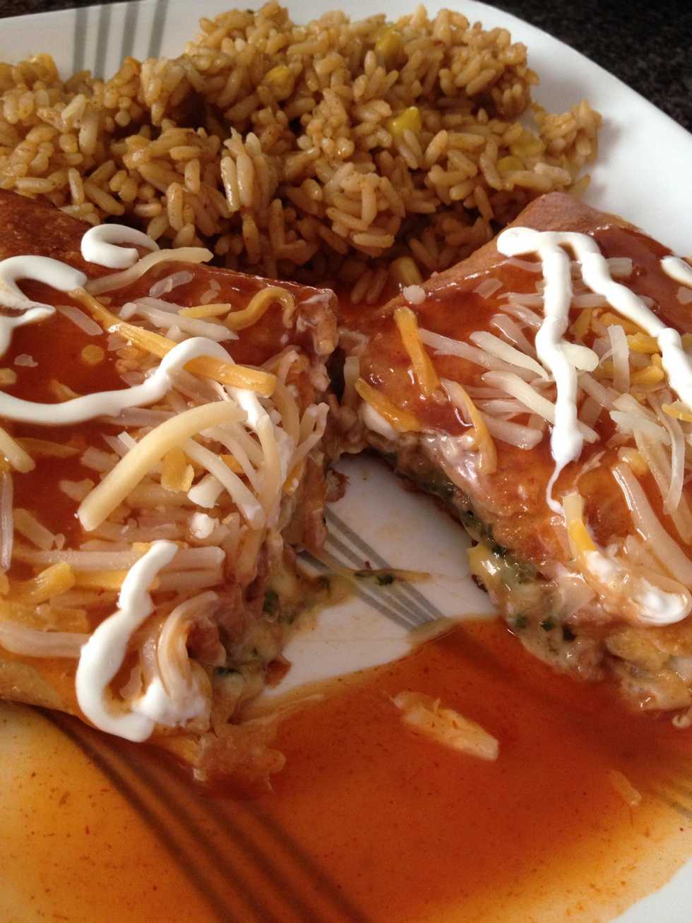 I placed enchilada sauce then chimichanga A bit more cheese and drizzled some sour cream yummy