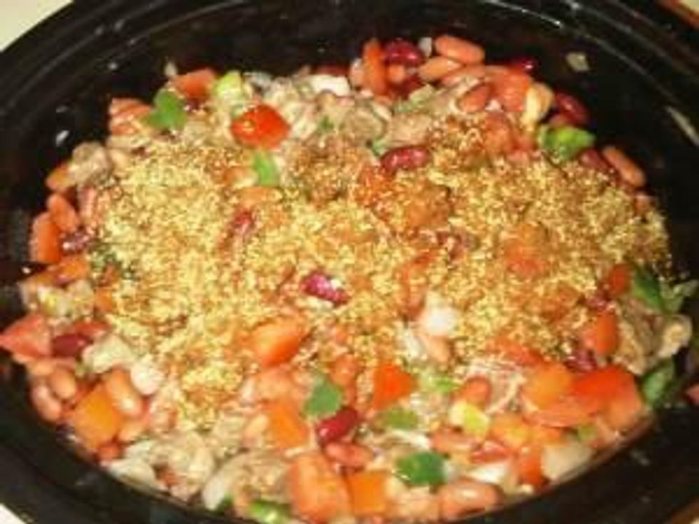 Before placing meat mix into the crockpot drain it in a drainer to remove any fat that was produced from cooking it. After you have done this place the meat mix into the crockpot and stir it.