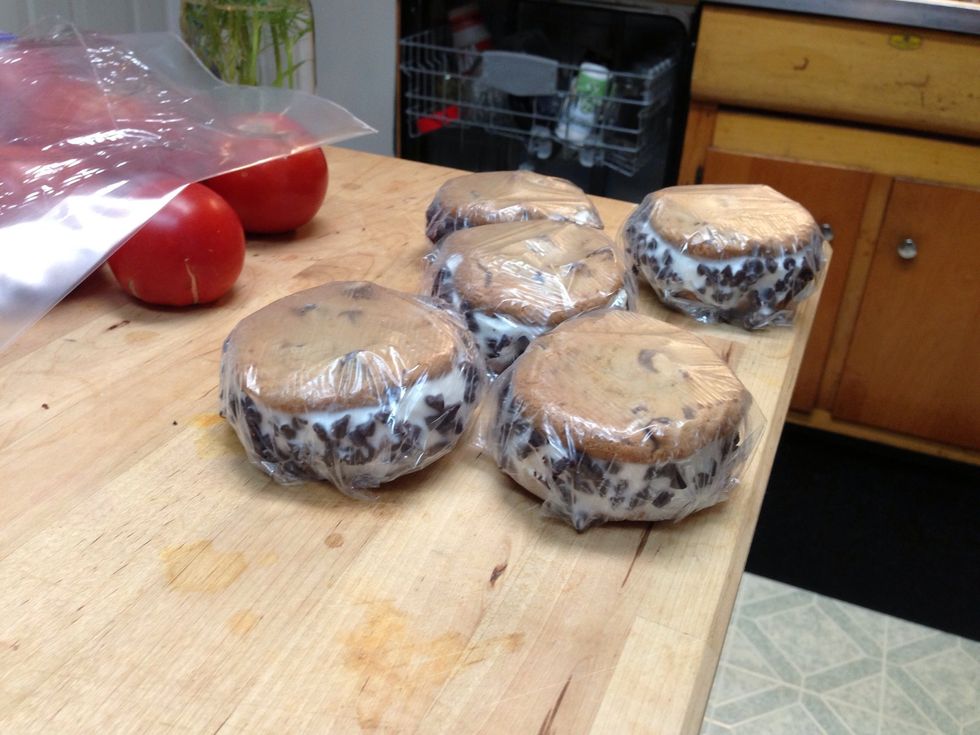 Once cookies are cold and hardened, scoop ice cream onto one cookie, sandwich it with another.