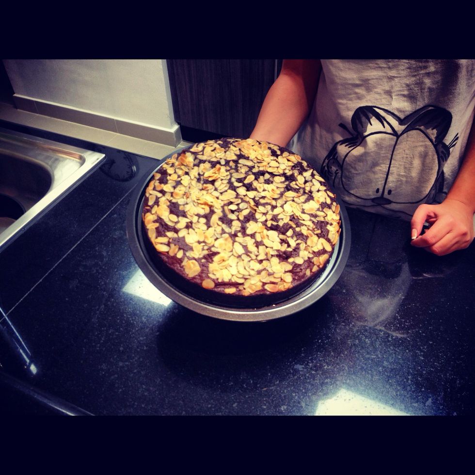 Sit the flour and baking powder onto the chocolate mixture and fold it in.