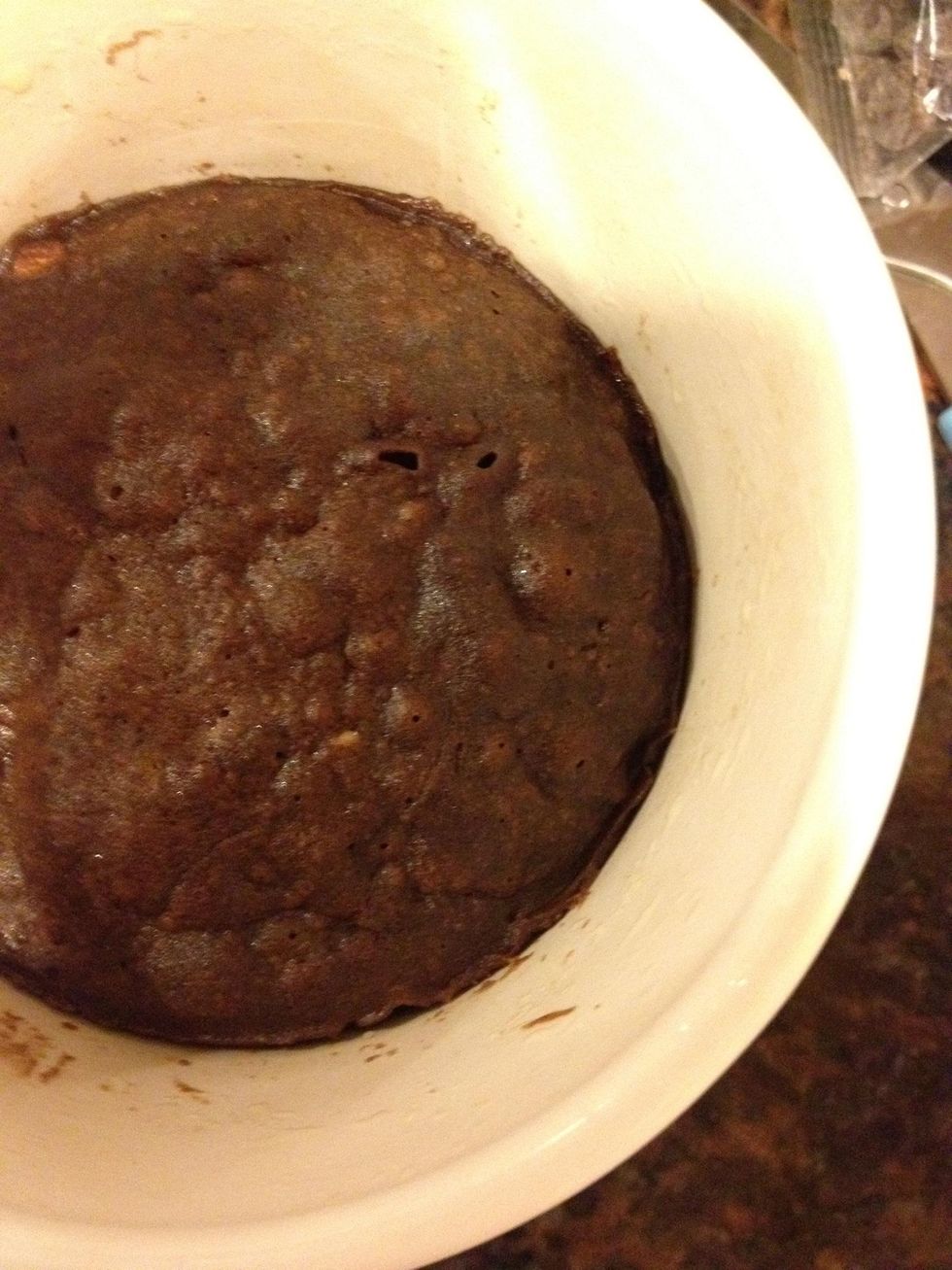 Spray cooking oil into a mug. Pour in the batter. Microwave for 1 minutes and 30 seconds, then let stand in the microwave for about a minute. (based on a 1100 W)