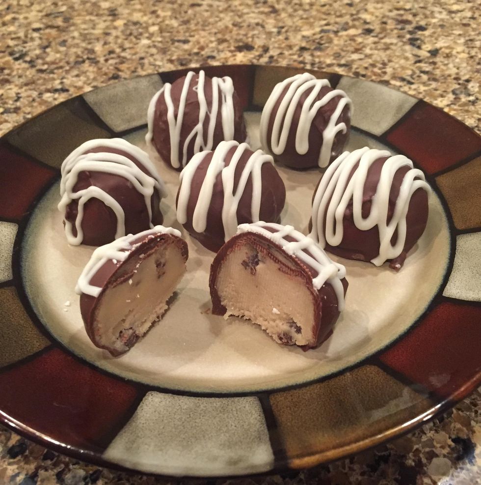 Roll the dough into small balls. Place on a wax paper cookie sheet. Then take all of them back into the refrigerator until you are ready to dip them in chocolate.