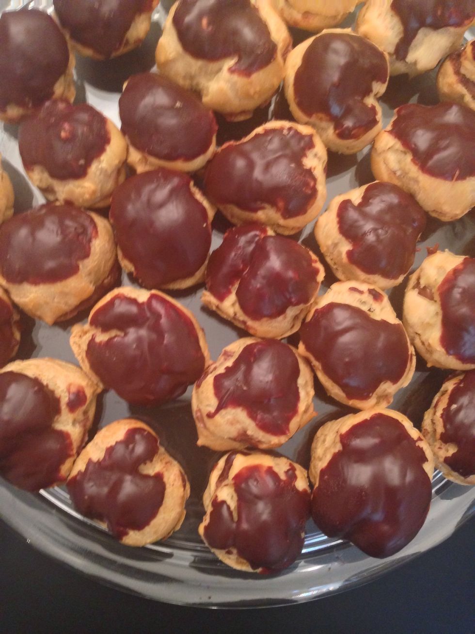 Out from the oven. Cut them with a serrated knife, and very carefully as they are fragile. Fill them with a spoon cover and dip the top in the chocolate glaze. Refrigerate. Serve in 2 hrs or so