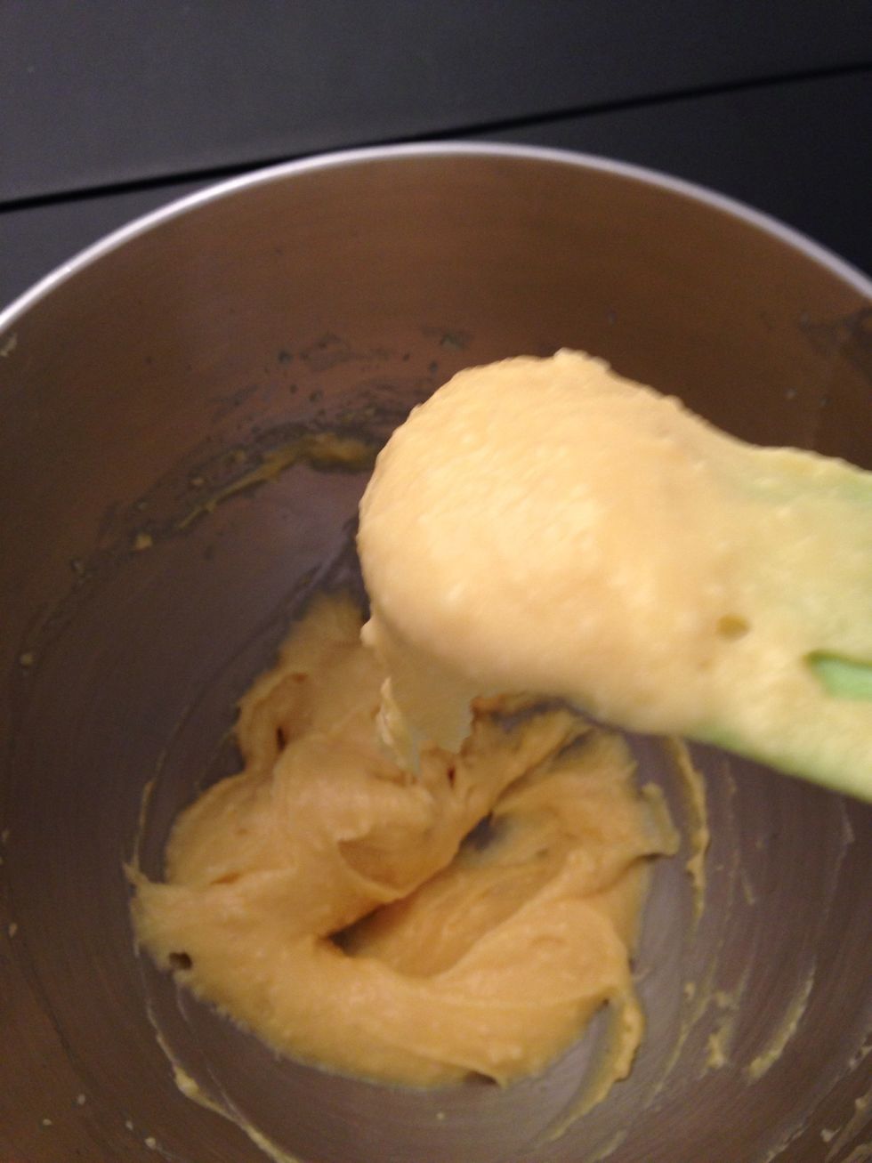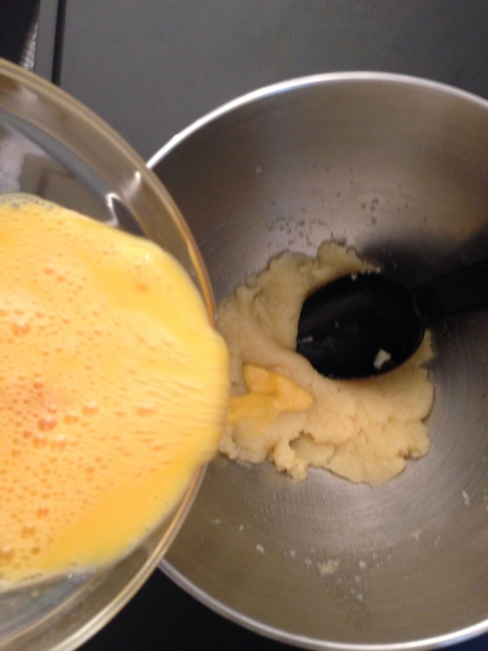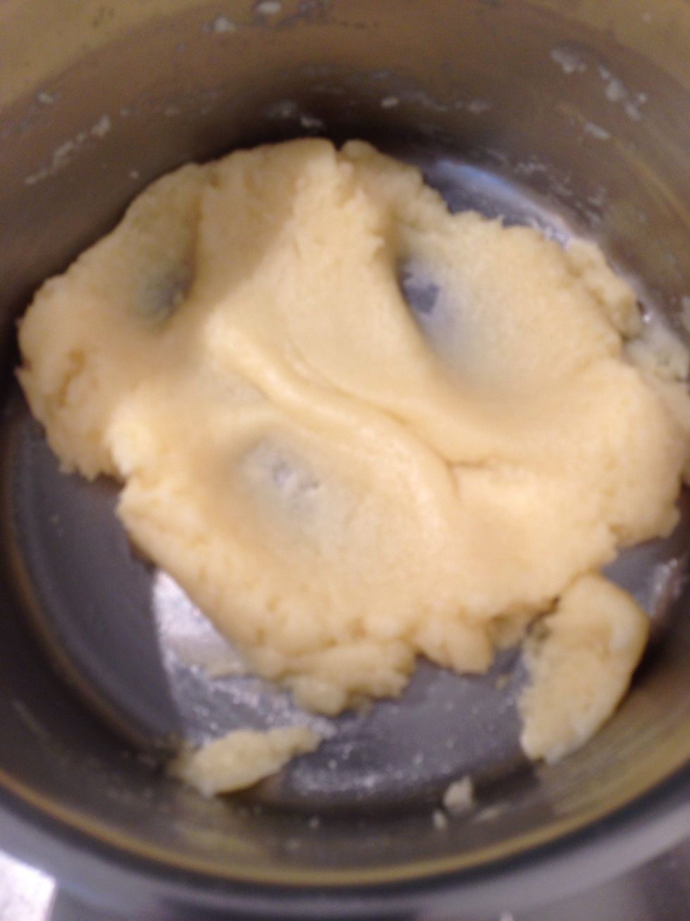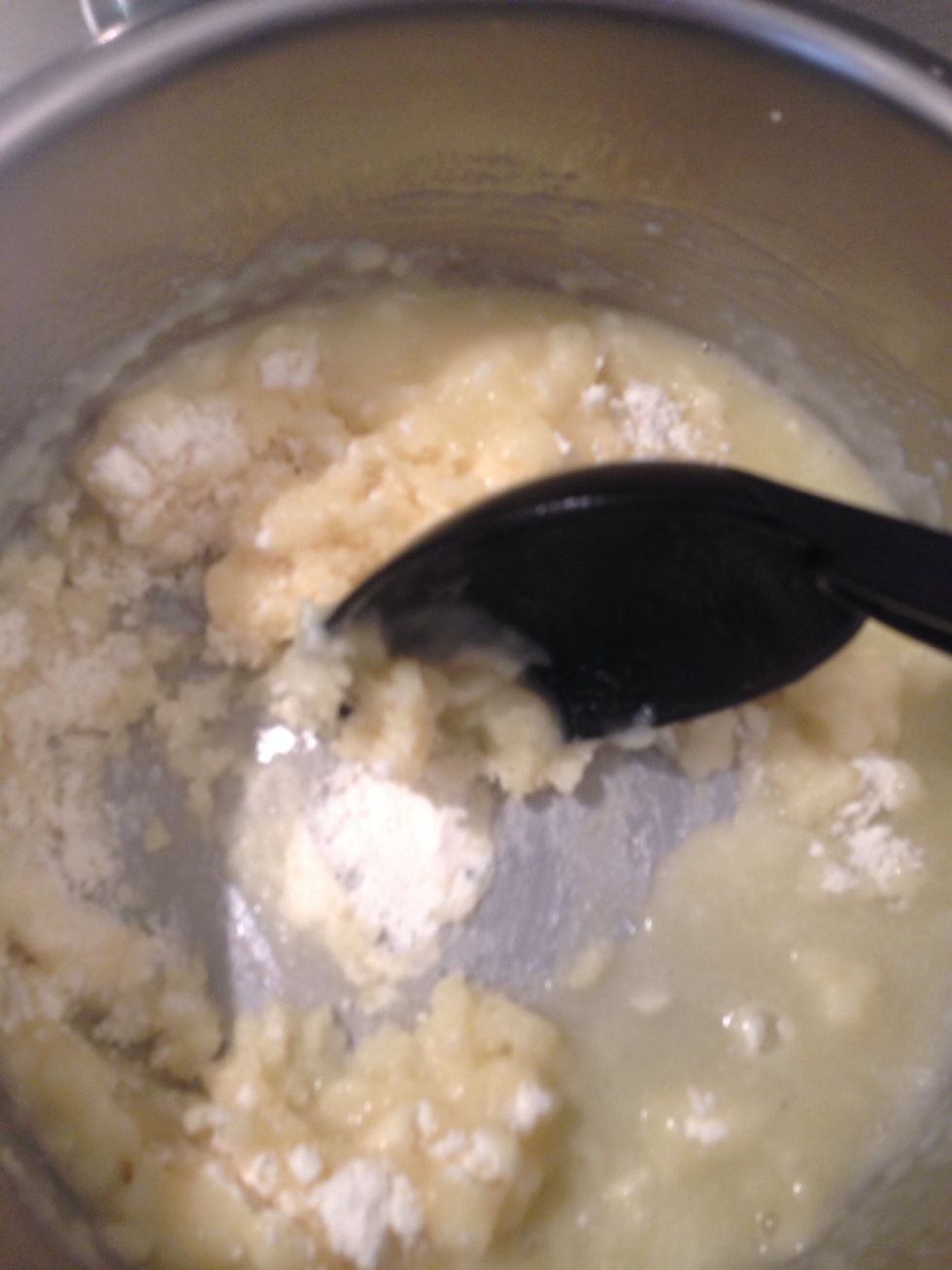 Off the fire. Mix vigorously with a spoon or?? Until it cools down to warm add the eggs and mix untill you get a shiny dough not too firm but not too runny.