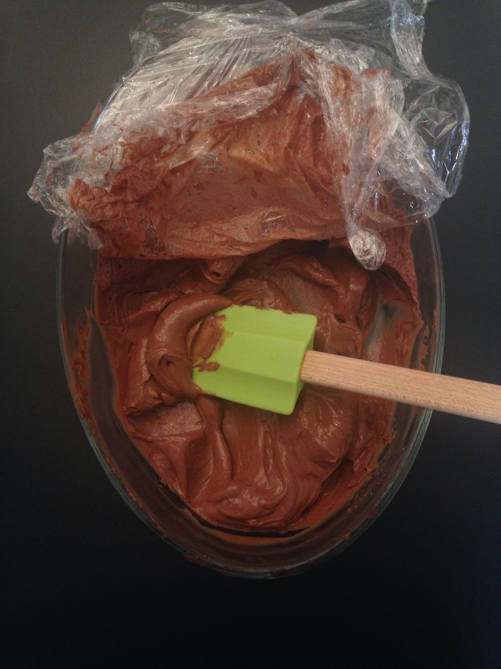 Put this chocolate pastry cream in recipient, cover with a kitchen film like in the photo. Leave to cool. It should b cold before using. So it could b done the day before